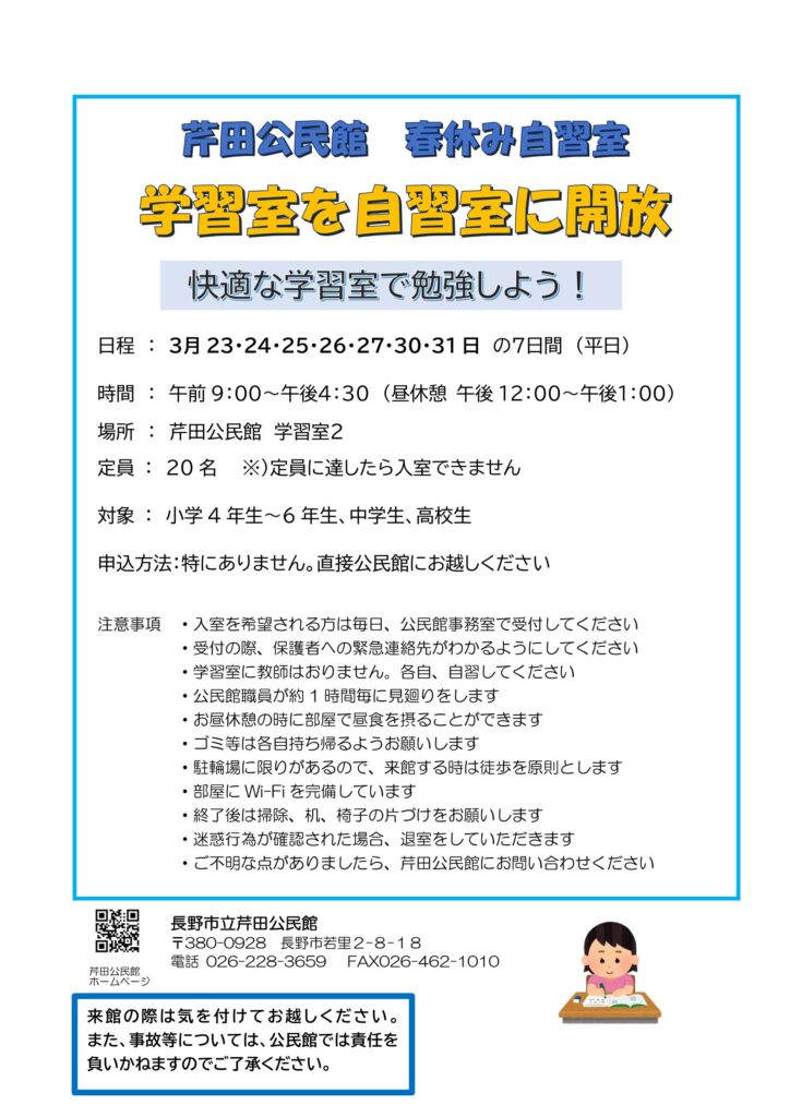 芹田公民館🌸春休み🌸学習室を📚自習室に開放✏️