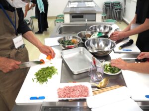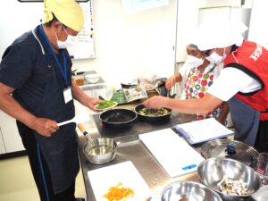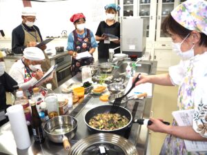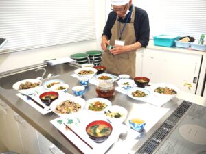 内容:美味しい健康料理教室 メニュー🍆秋ナスのそぼろ丼🌶️さつま芋茎炒め🧅もやしワカメ和え🥬モロヘイヤみそ汁🍵健康茶