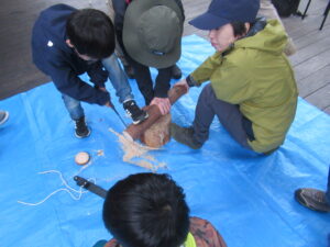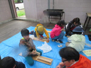 農作物収穫作業、間伐材での木工作、火起こし方法や体験をしました。