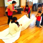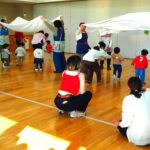 後半は、西川先生の親子体操の時間。一緒に歩いたり、ジャンプしたり、元気な時間。最後に新聞ビリビリ。豪快にたくさんの新聞紙をビリビリ☆楽しいね。