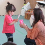 若里公園で親子で、水遊びをしました。水鉄砲や色水づくり、また、紙芝居を聞きました。