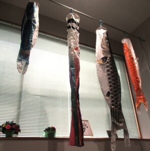 芹田公民館では、子どもたちの輝かしい未来と無病息災を願い、今年もこいのぼりと兜を飾りました。
