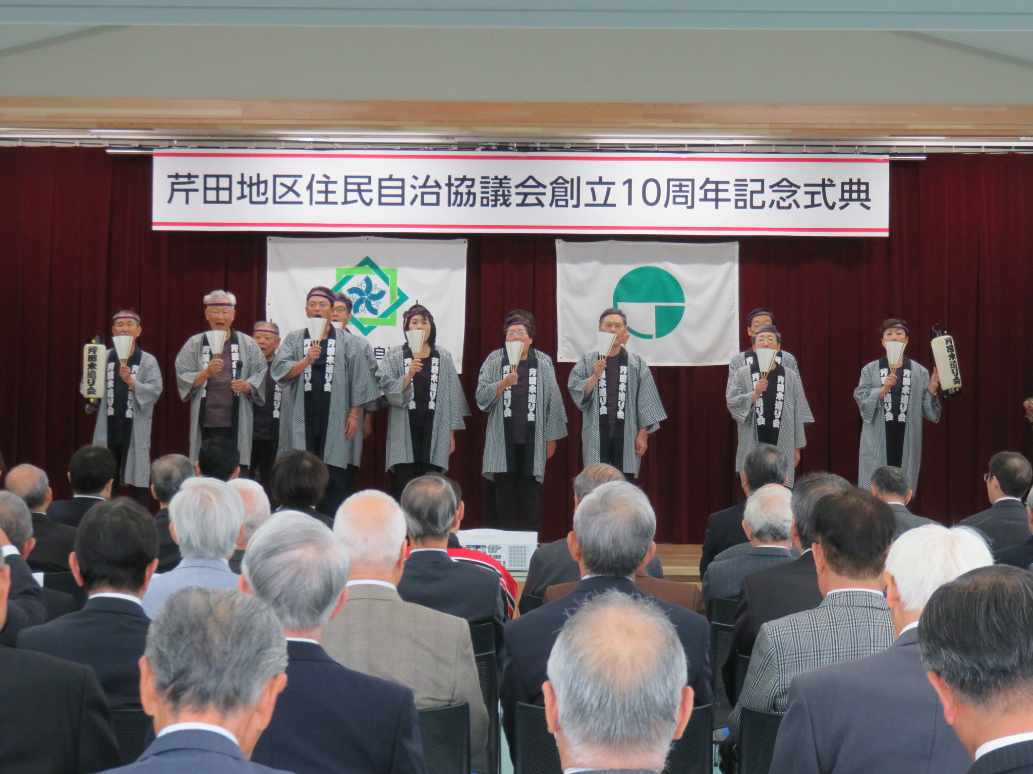 2020/12/07 芹田木遣り会の14名は、令和2年12月16日(水)長野市芸術館で行われる「長野市芸術館・松代文化ホールWEBフェス」に出演します。これは、「長野市ゆかりのアーティスト支援事業」の一環として開催されるイベントです。 さて、芹田木遣り会は現在、会員を募集中です。 お腹から声を出すことは、心にもからだにもとても良いことです。 是非ご一緒に、木遣りを唄ってみませんか。 令和元年10月に行われた「芹田地区住民自治協議会10周年記念式典」のオープニングセレモニー