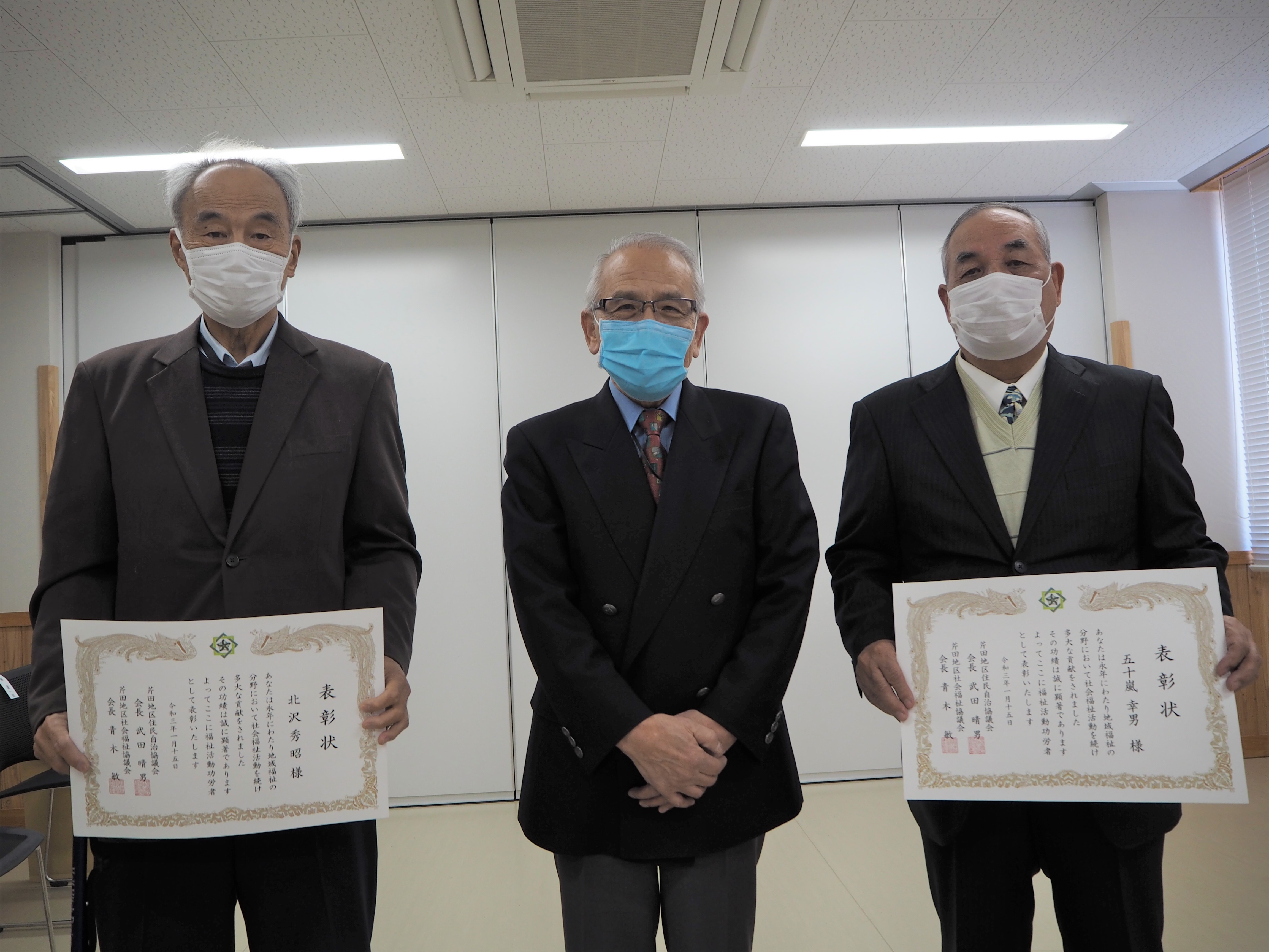 芹田地区社会福祉協議会は、1月15日(金)芹田総合市民センターにおいて、令和2年度社会福祉功労者表彰を行いました。昨年は「芹田地区ふれあい福祉大会」の中で執り行われましたが、今年は時間差で来館し、青木敏会長から賞状と記念品を受け取る形式にしました。