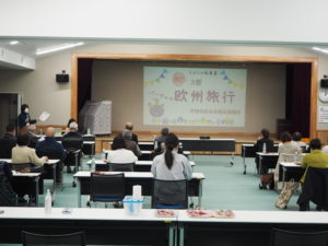 2021/11/24 芹田地区社会福祉協議会で毎年開催している「きぼうの旅」。 コロナウィルス対策で3密を避けるため、乗り物に乗らず・現地に行かず・地元にいたまま 安心して参加していただけるよう、「NO!3密バーチャル欧州旅行」を開催しました。 イギリス・イタリア・フランス・ドイツの4か国の観光スポットを映像と音楽、現地の スイーツで、参加者の5感が楽しめる工夫をしました。 芹田地区社会福祉協議会 会場内の様子 バーチャル旅行スタート ヨーロッパの風景と共にBGM ストレッチ体操で、リフレッシュタイム